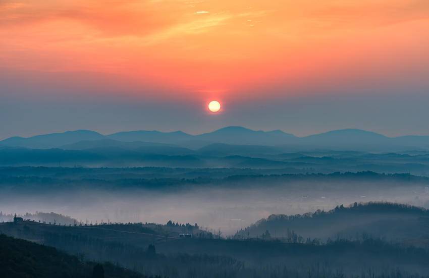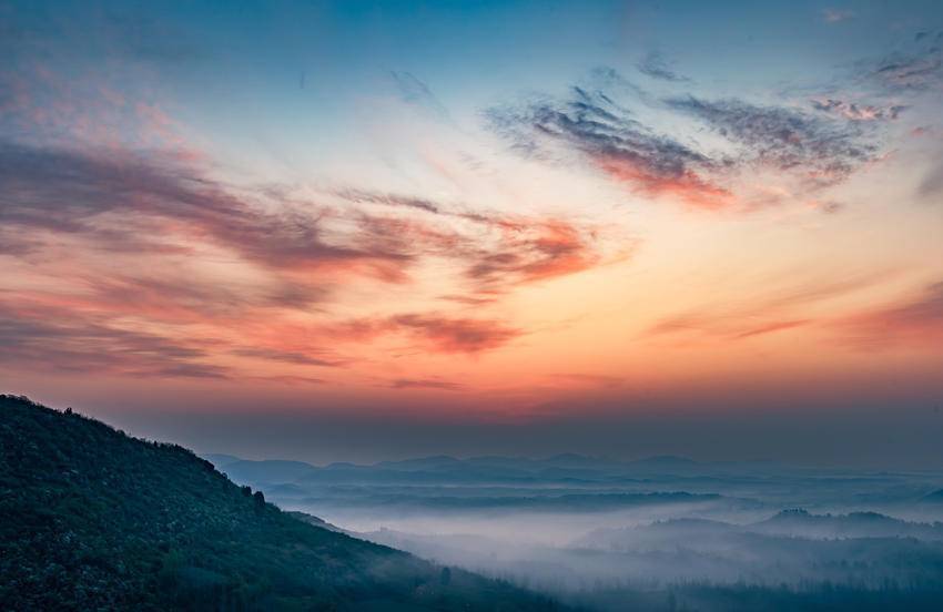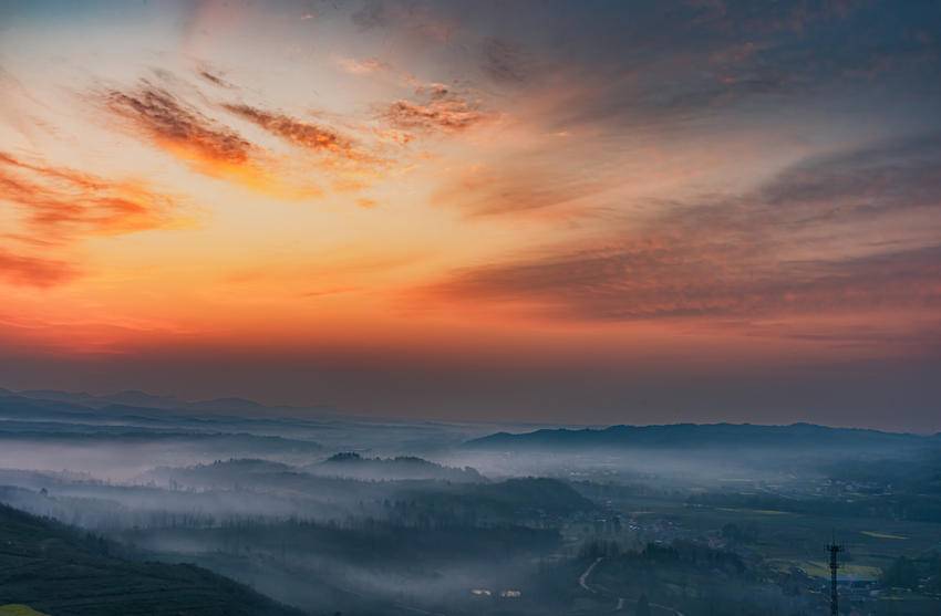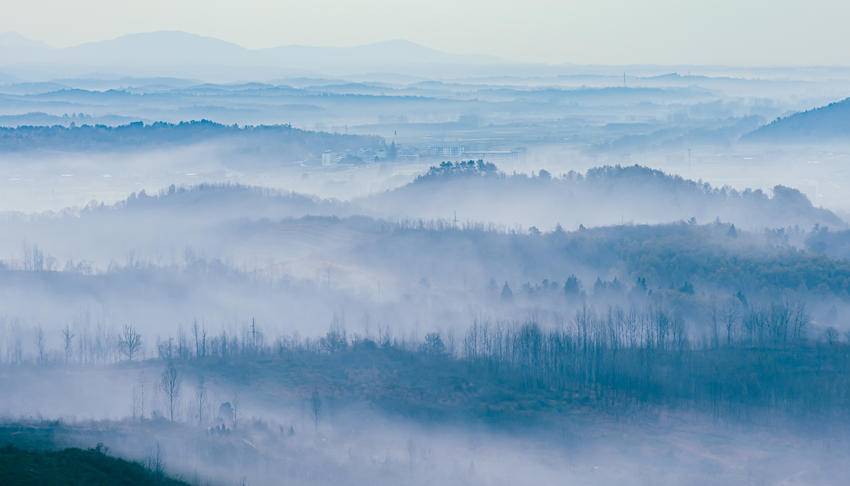 雾气在村舍上空蒸腾,和勃勃期望的树林、亮白的公路缠缠绕绕,风一吹就漾开去,把悉数村子齐托在了云海里,像极了藏在山野里的洞天福地。