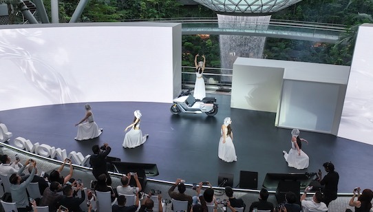 而在半个月前,新加坡樟宜机场,来自广州的目蔚科技(OMOWAY)在此举办发布会:聚光灯下,一台自均衡摩托车在缓缓行驶,莫得驾驶员,一个芭蕾舞演员在后座上优雅地踮起脚尖、旋转、舒展。车轮在动,但车身相等结识。