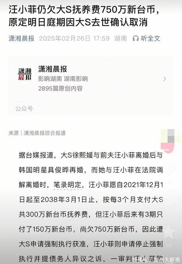 大S走了,可她和汪小菲之间还有讼事没打完呢。他俩离异后啊,就像两端争斗的公牛,矛盾和纷争那是步步升级,终末干脆闹到法庭上去了。这场讼当事者要等于围绕财产纠纷和供养费的事儿。流程长入,汪小菲得每三个月给大S支付上百万新台币的供养费。嘿,哪成想啊,没多久就出岔子了。汪小菲在这技艺竟然出现了少给的情况,统统欠了750万新台币呢。这可不得了,大S一气之下就向法院请求强制本质,然后他俩又接着打讼事了。这时候啊,汪小菲一审输了,他又不坚信,进行上诉,开庭时刻定到了2月27日。可谁能料想,气运倏得给大S来了个千里重一击,大S就这样倏得离世了,她的离开就像一颗重磅炸弹,在齐集上引起了山地风云。这时候人人就开动矜恤,他俩这场讼事该怎么办呢?恶果啊,比及开庭那天,因为大S的圆寂,这场讼事只可取消了,也瑰丽着他俩之间的恩仇透澈画上了句号。