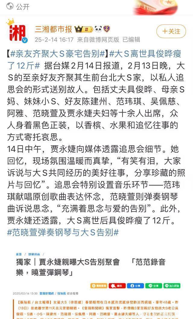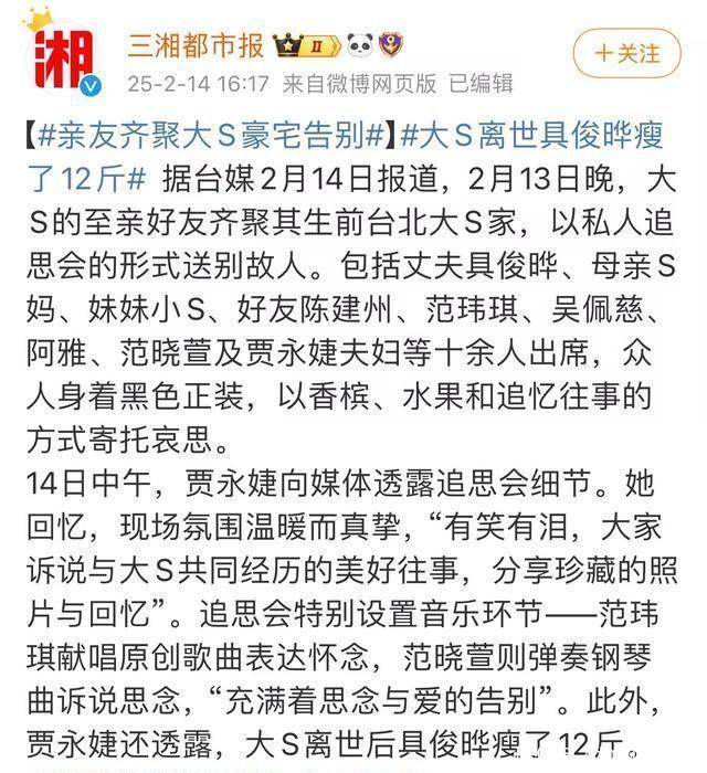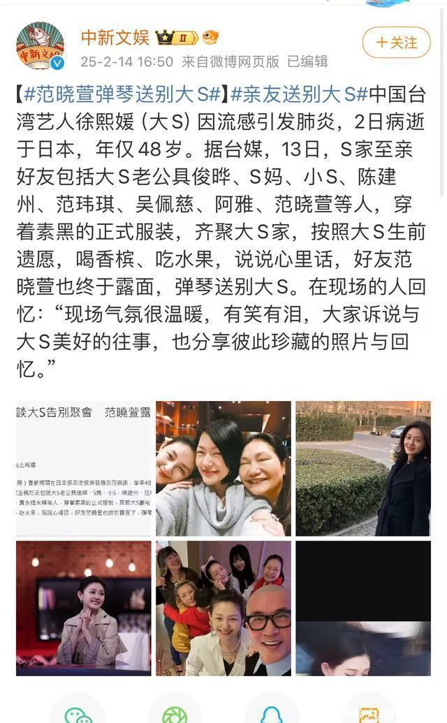 大S圆寂的时候没办告别式,不外在亲一又之间倒是办了一场告别回顾念会。这场回顾念会上啊,大S的死党好友们齐来了,一个个一稔素玄色的正装,可慎重了。按照大S生前的遗志,人人在一说念回忆她那些好意思好的旧事。对了,大S的好友范晓萱还弹琴为大S送别呢。