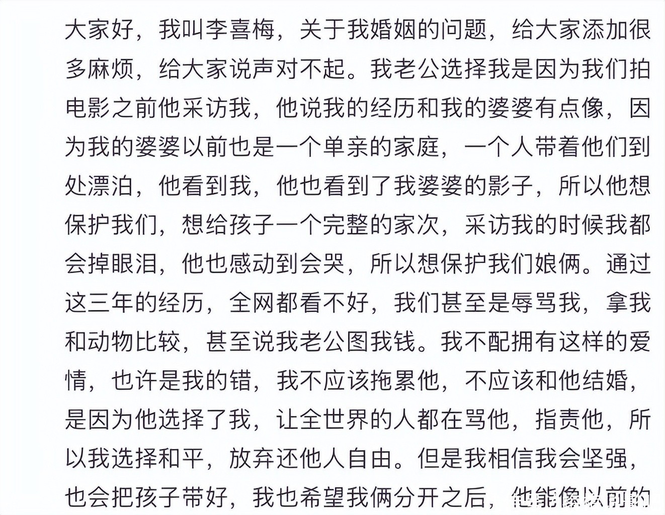 大双的一番谈话,李喜梅亦然相称感动,在大双恢复两东说念主仳离后,她也发了视频。