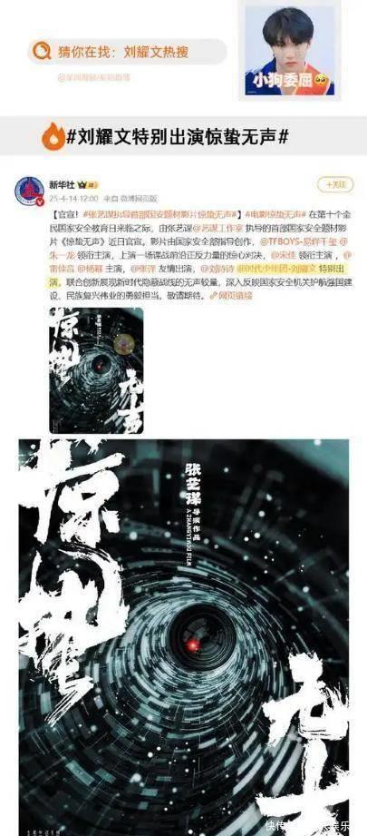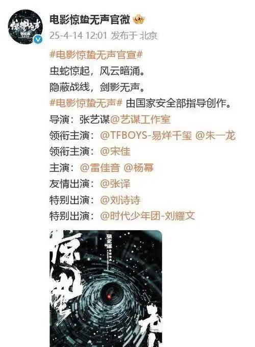 4月14日,张艺谋握导的国安题材电影《惊蛰无声》重磅官宣,主演名单号称“王炸组合”:易烊千玺、朱一龙首度互助上演正邪交锋,宋佳、雷捷报、杨幂实力加盟开云「中国」Kaiyun官网登录入口,张译、刘诗诗、刘耀文等惊喜助阵。