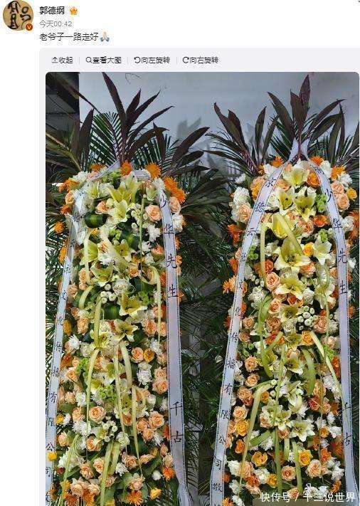 就在这公论风暴中心,郭德纲也发声了。夜深,他在一又友圈发了条音书,说“总共走好”,还晒了花圈像片。但他没去现场,派了岑岭去了。岑岭在灵堂发了像片,说“从小爱听您相声”。灵堂像片里摆了不少花圈,中间是老爷子的遗照,看着挺尊荣肃肃的。