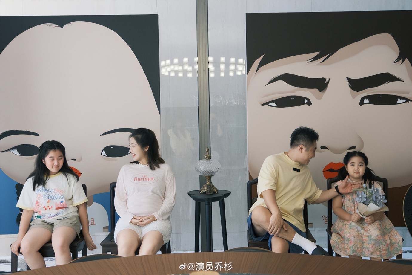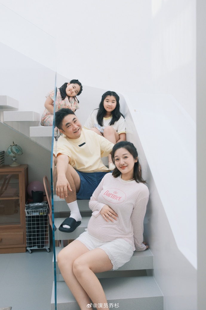 乔杉和莫丹带着两个男儿坐在楼梯处拍摄了超绝好意思的全家福,孕妈坐在最前边,手抚孕肚又好意思又和蔼。乔杉坐在浑家死后,笑貌灿烂完全等于乐得见牙不见眼。密斯妹坐在爸爸死后,这样一看,姐妹俩是真的太像爸爸了,不仅笑起来像,脸型和眉眼都和乔杉一模一样。