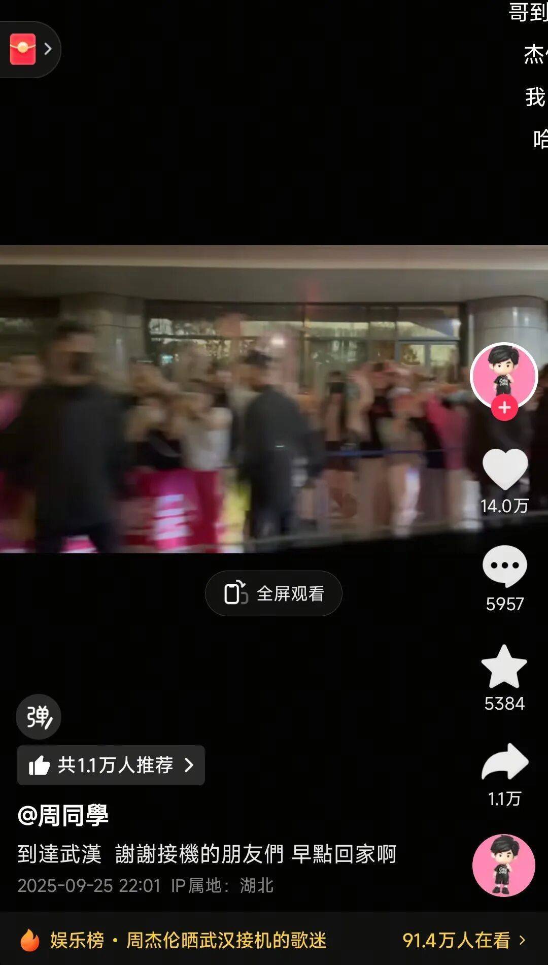 十年没来武汉,周杰伦对武汉歌迷也给出了回馈,25日22:01,他在抖音发声:到达武汉,谢谢接机的一又友们,早点回家啊!
