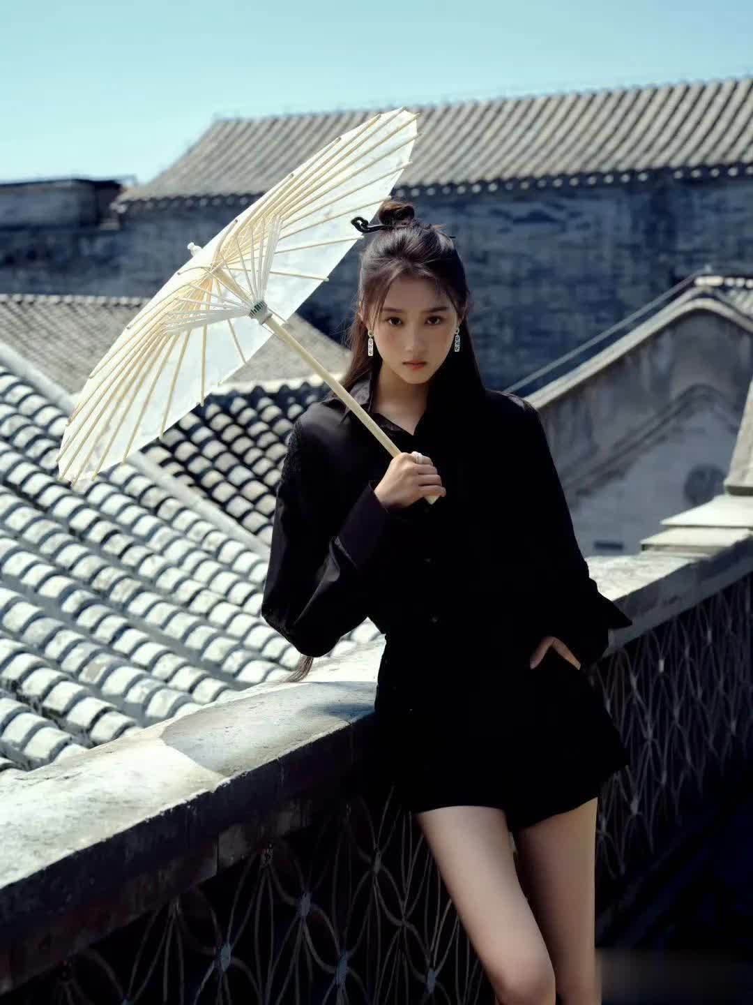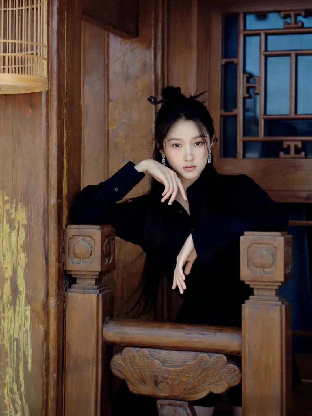这孑然利落黑衣演绎冷脸古风女将,修身剪裁完好展现了她的高挑纤细体魄!