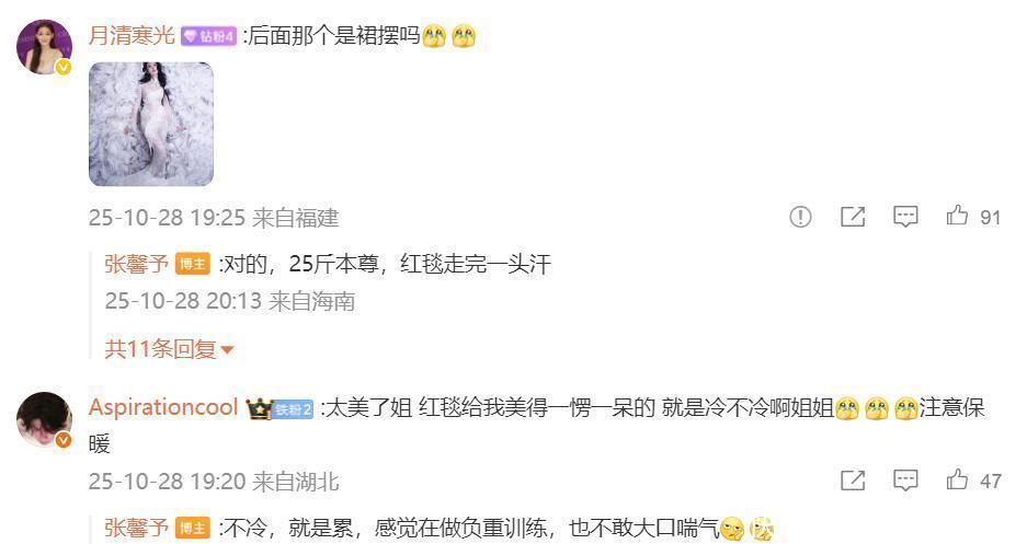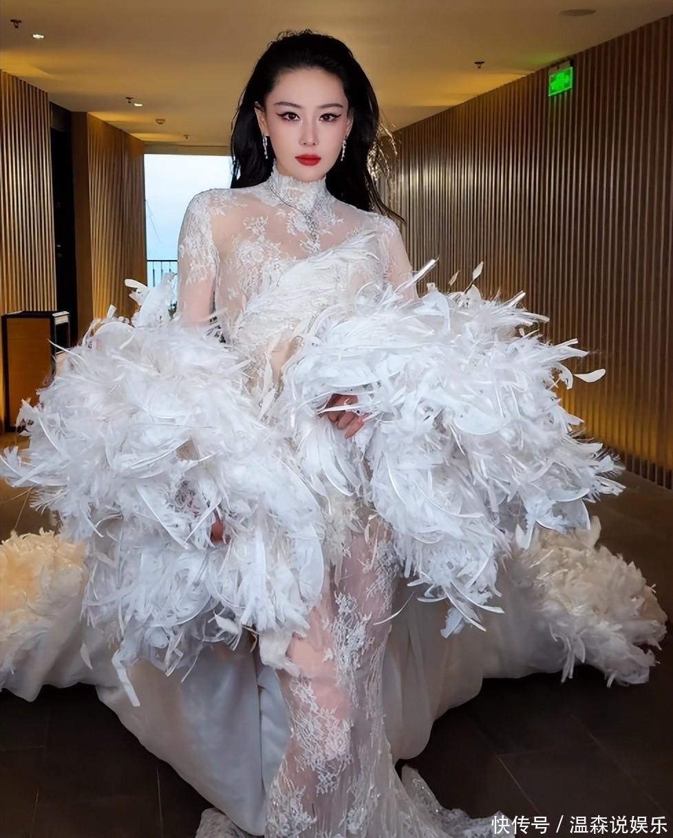 张馨予此次穿的征服由两部分构成,一部分是大的羽毛裙摆,一部分是贴身蕾丝裙,张馨予自爆单是羽毛裙摆重达25斤,她在旅店试穿时差未几走不动说念,很是重。