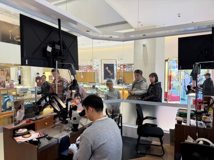 记者在现场看到,不少消耗者刚进店门,就被这间定制工坊紧紧引诱。有东说念主安身玻璃围挡前,敬爱地向内放哨;有东说念主紧盯露出屏,耳不旁听地不雅赏工匠们的精工细作。老凤祥国度级非遗技能金银细工第七代传承东说念主、上海好意思术家协会会员周天应先容,老凤祥11位非遗传承东说念主将依次进驻工坊,现场演示金工技能。