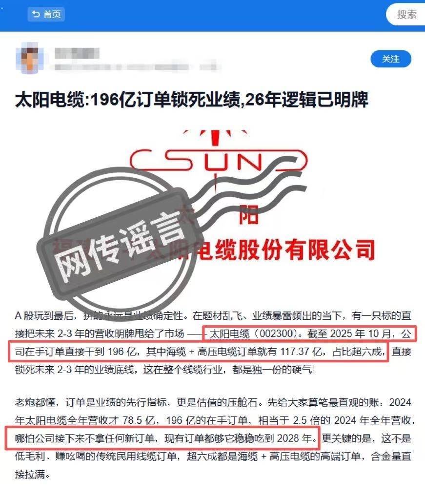 近日开云「中国」Kaiyun官网登录入口,《21辟谣》防范到,有音尘称松手2025年10月,太阳电缆(002300.SZ)“在手订单告成干到196亿,其中海缆+高压电缆订单就有117.37亿,占比超六成”,并宣称“哪怕公司接下来不拿任何新订单,现存订单皆够它稳稳吃到2028年”,激励商场颐养。