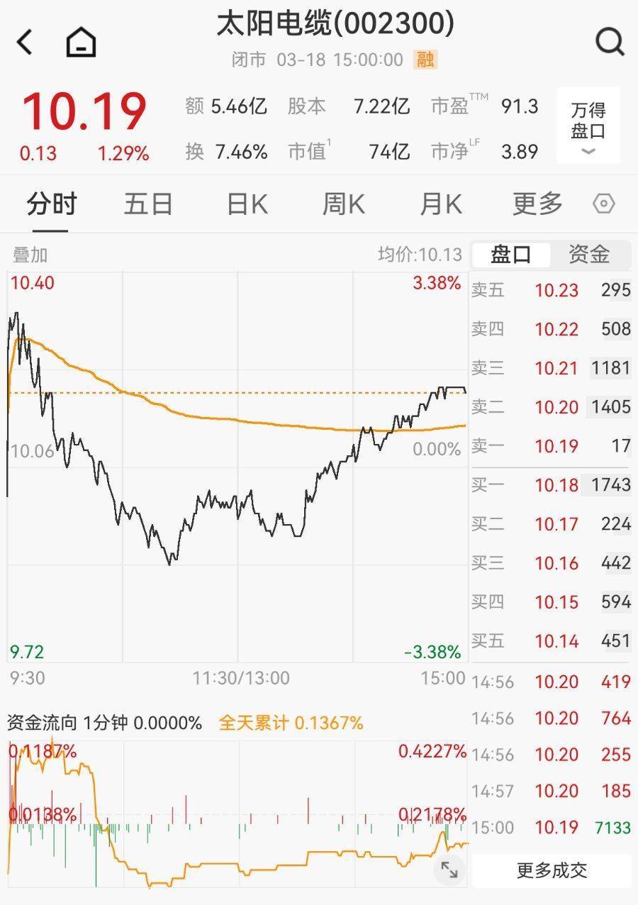 松手3月18日收盘,太阳电缆股价报10.19元/股,涨1.29%。